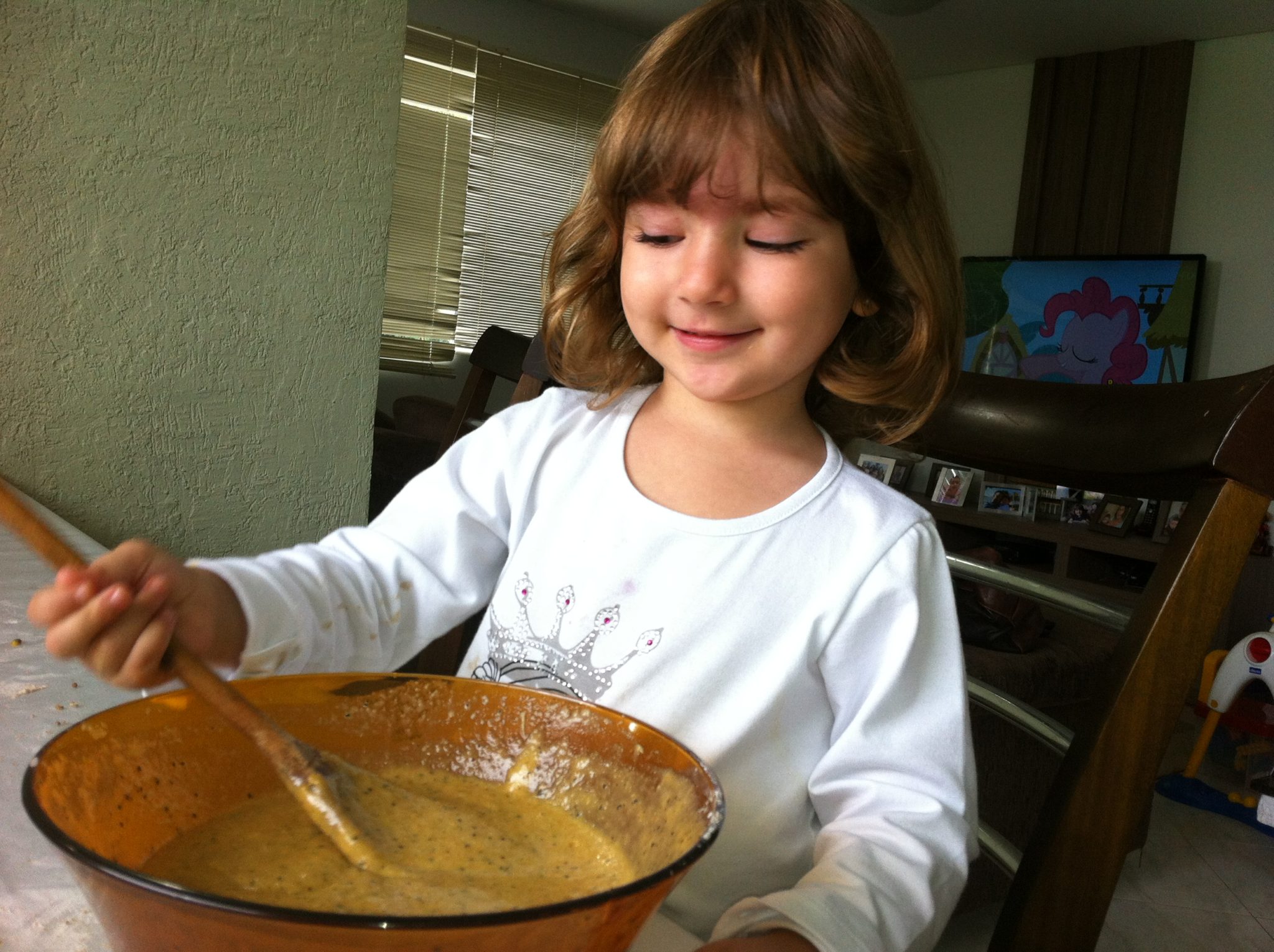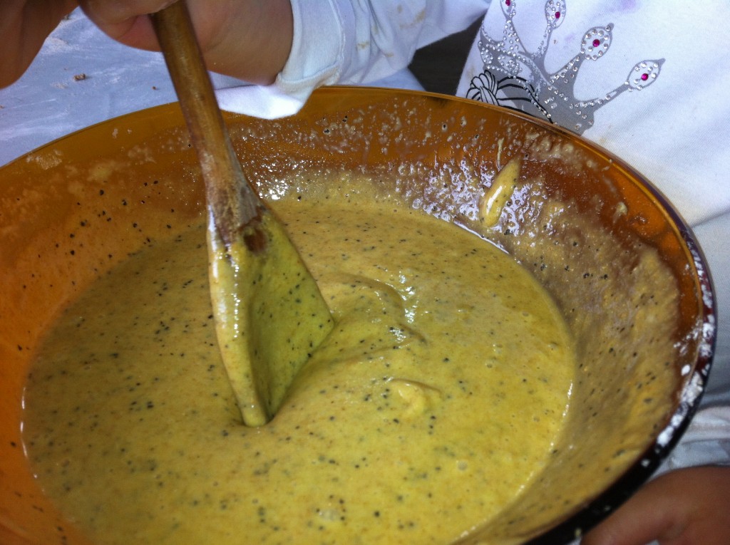 – Com ajuda de um fouet (mas eu usei colher de pau mesmo), acrescente a parte líquida à seca e vá misturando aos poucos, até formar uma massa homogênea.