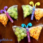 Qual criança pequena não adora ver e tentar pegar borboletas?Então, tentar fazer uma borboleta com a comida pode ser interessante. A ideia com os saquinhos (com pregador no meio) é ideal para festas de aniversário ou para levar na escolinha, por exemplo.